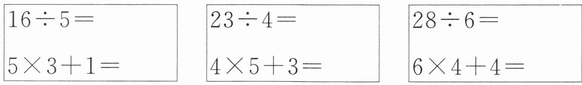 2. $16\div5 = 3\cdots\cdots1$;$23\div4 = 5\cdots\cdots3$;$28\div6 = 4\cdots\cdots4$;$5\times3 + 1 = 16$;$4\times5 + 3 = 23$;$6\times4 + 4 = 28$;被除数