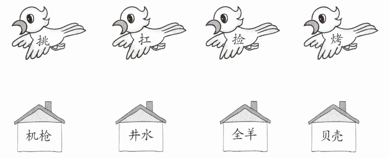 挑 —— 井水(不太准确,可能题目设置有小瑕疵,从现有选项看相对合理);扛 —— 机枪(不太准确,常规“扛枪”更准确,但按图连线);捡 —— 贝壳;烤 —— 全羊。