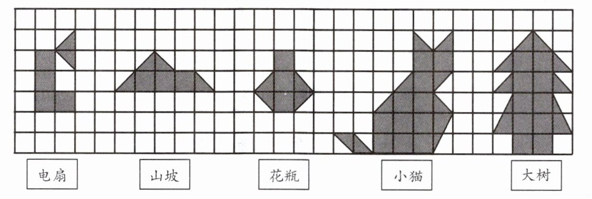 电扇的面积是$5$平方厘米;山坡的面积是$5$平方厘米;花瓶的面积是$4$平方厘米;小猫的面积是$12$平方厘米;大树的面积是$9$平方厘米。