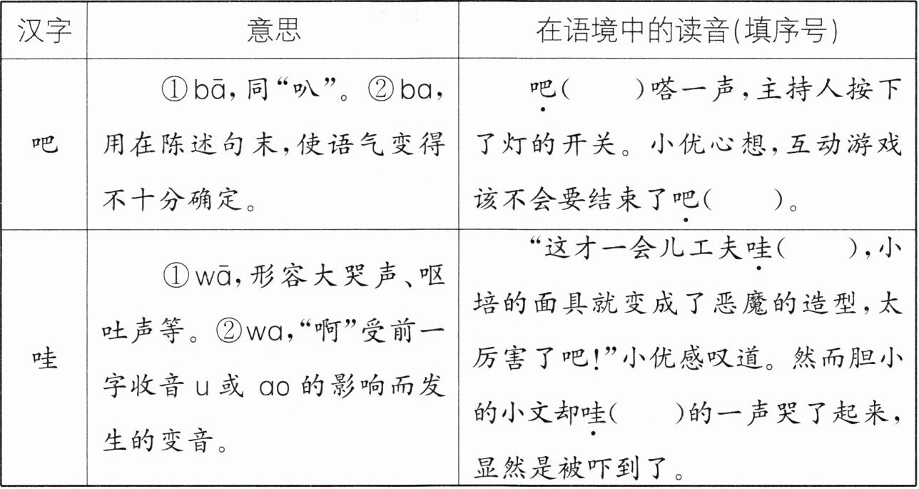 哇 ①wā,形容大哭声、呕吐声等。②wa,“啊”受前一字收音u或ao的影响而发生的变音。 “这才一会儿工夫哇(),小培的面具就变成了恶魔的造型,太厉害了吧!”小优感叹道。然而胆小的小文却哇()的一声哭了起来,显然是被吓到了。