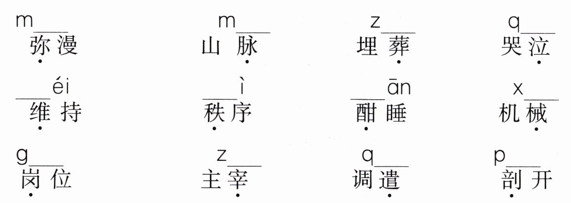 mí(弥)、mài(脉)、zàng(葬)、qì(泣)、wéi(维)、zhì(秩)、hān(酣)、xiè(械)、gǎng(岗)、zǎi(宰)、qiǎn(遣)、pōu(剖)。