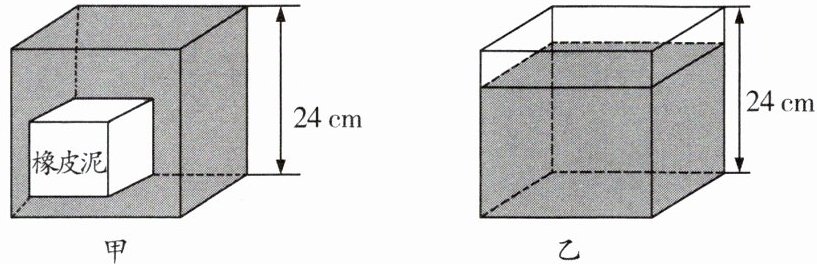 1. 一罐橡皮泥,可以将它做成一个棱长为 12 cm 的正方体。如果将这罐橡皮泥放到一个有水的长方体容器中,水面和容器口齐平(如图甲)。如果将这罐橡皮泥取出,水面到容器口的距离是 6 cm(如图乙)。