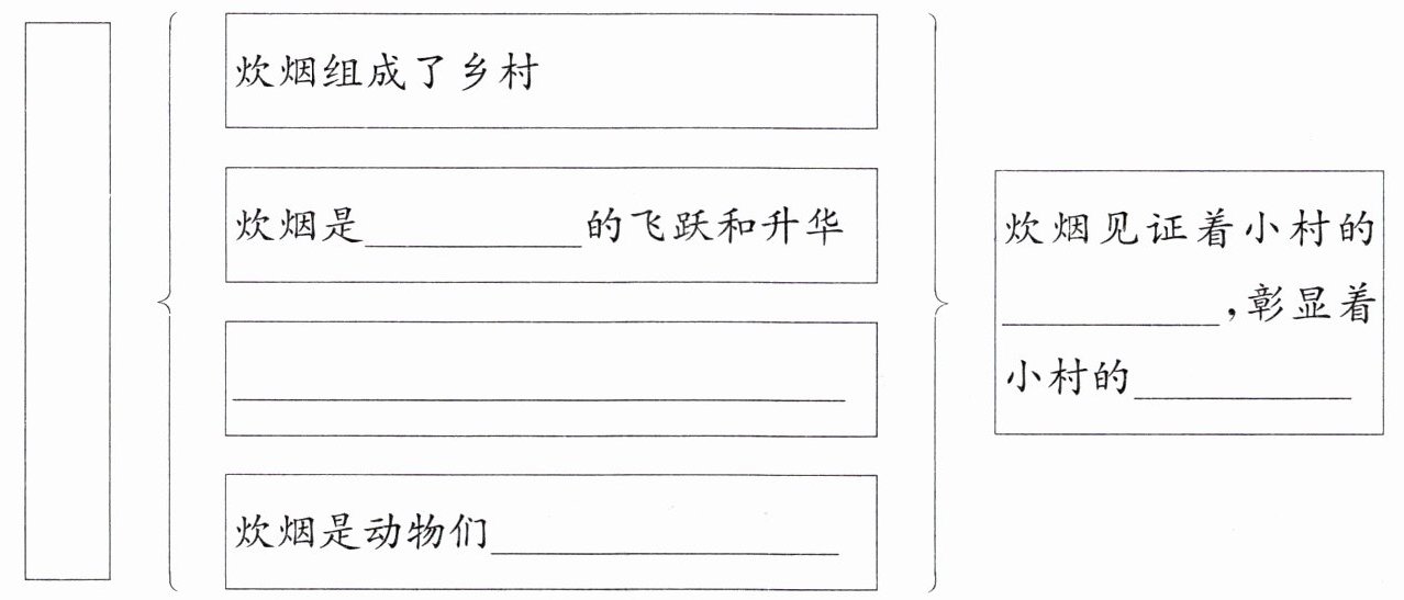 ③很久以前,它们还不是炊烟,它们也从不曾想过能成为炊烟。它们是一株株碧翠的生命,鲜活在野外,灿烂着沃土,恣(zì)肆(sì)了生命。鲜艳的花朵,引来了劳碌的蜜蜂;满身的翠绿,被鸟们衔去做巢;敞开的胸怀,接纳了大把的阳光。离开了那片土地,它们枯萎了,风干了。但是枯萎不等于死亡,风干也未必是消失。枯萎,是更鲜活的再生;风干,有了更空灵的飘逸。缕缕炊烟,是它们的魂魄,是它们的眷恋,是它们生命更精彩的绽放。万事万物,都是通过一缕炊烟得到了飞跃和升华。