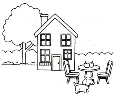 This is a picture 1 our house. It has four windows. Near the house, there is a table and two chairs. There is a dog 2 the table. It's a very nice dog. We love it very much. 3 the table, there are two