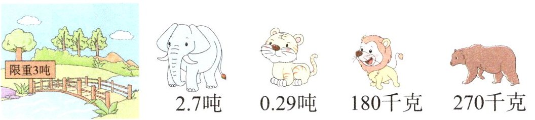 1. 下面是4只动物的质量。一座限重3吨的桥,这4只动物能同时过桥吗?