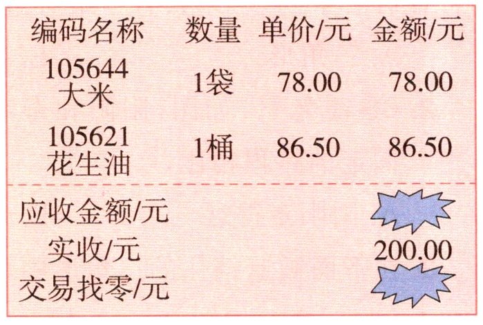 2. (生活体验)苗苗妈妈带了200元到超市购买了大米和花生油,回家后发现收据被污渍盖住了一部分,如下图所示。请你算一算:应收金额是多少? 交易找零是多少?