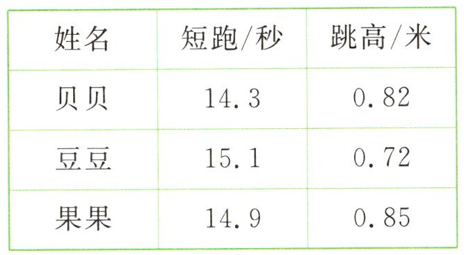 1. (易错题)在一次体育课上,贝贝、豆豆和果果的短跑和跳高成绩如下。谁跑得最快? 谁跳得最高?