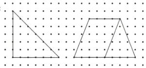 在下面的点子图中分别画一个等腰直角三角形和一个梯形;在画好的梯形中画一条线段,将这个梯形分成一个平行四边形和一个三角形。