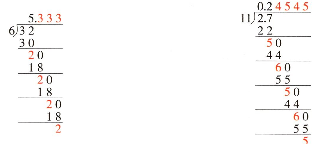 $ 3 2 ÷ 6 = 5. 3 3 3 … $ $ 2. 7 ÷ 1 1 = 0. 2 4 5 4 5 … $