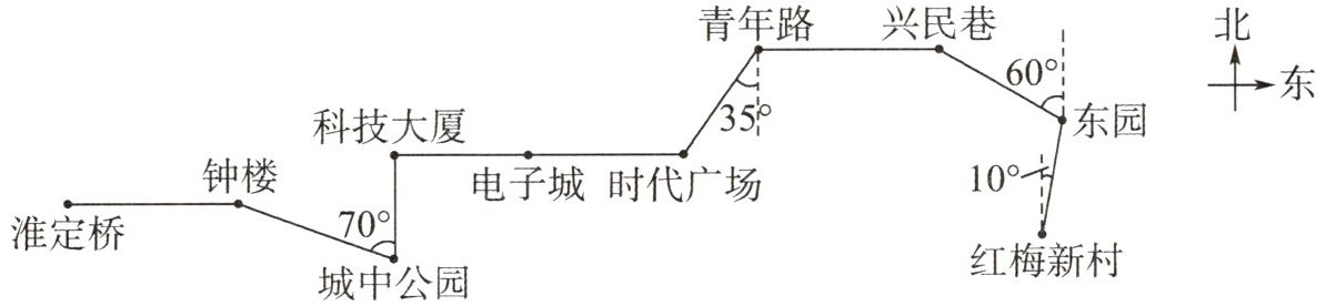 从红梅新村先向北偏东$10^{\circ}$方向行驶1站到东园,再向北偏西$60^{\circ}$方向行驶1站到兴民巷,再向正西方向行驶1站到青年路,再向南偏西$35^{\circ}$方向行驶1站到时代广场,再向正西方向行驶2站到科技大厦,再向正南方向行驶1站到城中公园,再向北偏西$70^{\circ}$方向行驶1站到钟楼,最后向正西方向行驶1站到淮定桥
