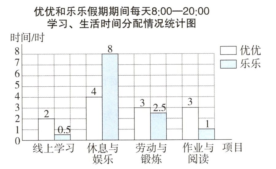 1. (生活体验)下面是优优和乐乐两名同学假期期间每天8:00-20:00学习、生活的时间分配情况统计图。