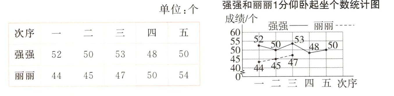 2. (名校期末真题)强强和丽丽每隔一星期1分仰卧起坐的训练成绩情况如下表。