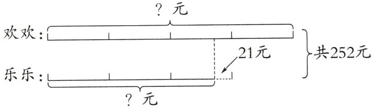 思路点拨 解决此类问题可以画图分析。当欢欢花掉她钱数的$\frac{1}{4}$后,还剩下$\frac{3}{4}$,我们可以假设欢欢的钱有4份,用去$\frac{1}{4}$也就是用去了1份,还剩下3份,如果乐乐的钱能多21元,那么此时两人的钱应该是一样多的,都有3份。用252元加上21元,就对应着欢欢的4份加乐乐的3份,这样就可以先求出1份的钱是$(252 + 21)÷(4 + 3) = 39$(元),再分别求出两人有多少钱。