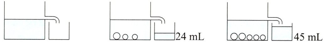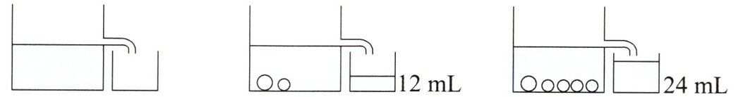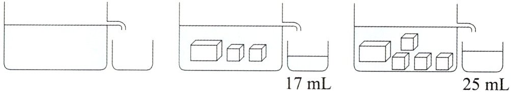 思路点拨 解决此类问题需要明确排出的水的体积等于浸没的物体的体积。观察图可知,没有物体浸没时,水面正好和排水口持平,放入1个大圆球和1个小圆球后,排出了12mL的水,12mL=12cm³,所以1个大圆球和1个小圆球的体积和为12cm³。第三幅图中又放入3个小圆球后,多排出了24-12=12(mL)的水,12mL=12cm³,所以3个小圆球的体积和为12cm³,进而能够求出1个小圆球的体积,用1个大圆球和1个小圆球的体积和减去1个小圆球的体积即可求出1个大圆球的体积。