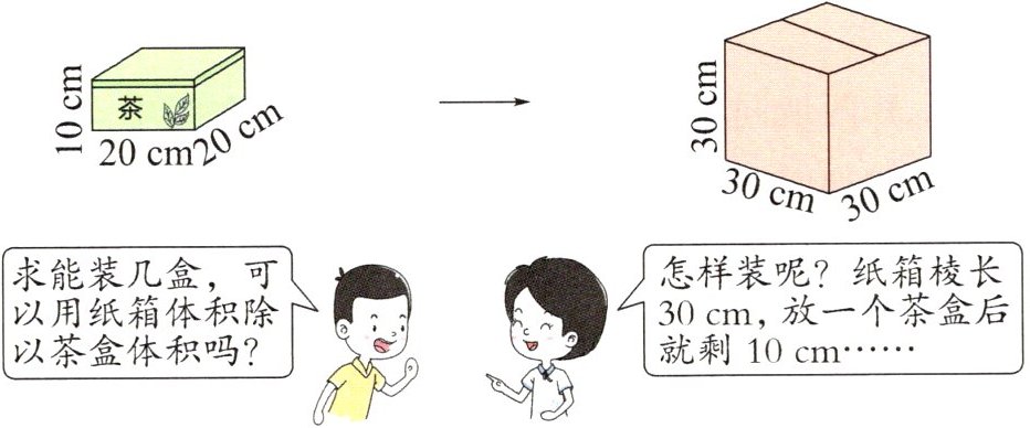 思路点拨 结合茶盒长、宽、高的长度和纸箱的棱长,因为10+20=30(cm),所以想要在正方体纸箱里装尽可能多的茶盒,可以沿棱长横放一个再竖放一个,放满即可。