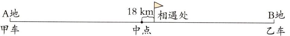 乙车离中点还有18km,甲车超过中点18km,说明甲车比乙车多行驶了18+18=36(km),则甲车行驶的路程-乙车行驶的路程=36km。