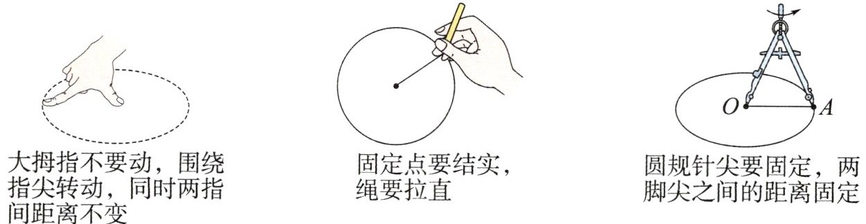 画圆的方法很多,如手指画圆法、实物画圆法、系绳画圆法、圆规画圆法等。一般用圆规画圆法。