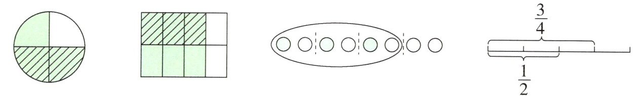 1. (算理理解)下面各图中,能表示$\frac {3}{4}×\frac {1}{2}$的有( )个。