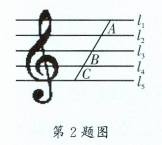 2. (成华区一诊)如图,五线谱是由等距离、等长度的五条平行横线组成的. 某条直线分别与横线$l_{1},l_{3},l_{4}交于点A,B,C$,若线段$AB= 3$,则线段$BC$的长是 (