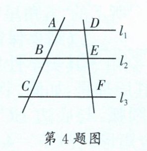4. (成都中考)如图,直线$l_{1}// l_{2}// l_{3}$,直线$AC和DF被l_{1},l_{2},l_{3}$所截,$AB= 5,BC= 6,EF= 4$,则$DE$的长为 (