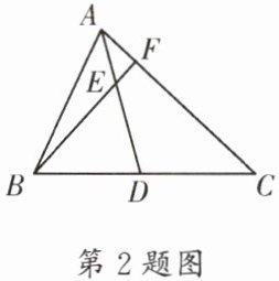 2. (天府新区一诊)如图,AD 是$\triangle ABC$的中线,E 是 AD 上的一点,且$AE:ED= 1:2$,BE 的延长线交 AC 于点 F,则$AF:FC= $____.