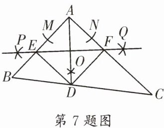 7. (七中育才)如图, 在$Rt\triangle ABC$中, $\angle BAC= 90^{\circ}$, 按以下步骤作图: ①以点$A$为圆心, 适当长为半径画弧, 分别交$AB, AC于点M, N$; ②再分别以点$M, N$为圆心, 大于$\frac{1}{2}MN$的长为半径画弧, 两弧交于点$O$, 连接$AO并延长交BC于点D$; ③分别以点$A, D$为圆心, 大于$\frac{1}{2}AD$的长为半径画弧, 两弧分别交于$P, Q$两点, 作直线$PQ$, 分别交$AB, AC于点E, F$. 若$AB= 3, AC= 4$, 则$AE$的长为______.
