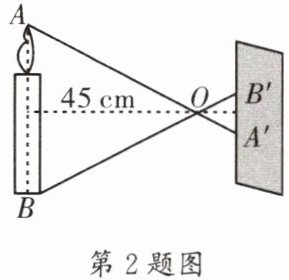 2. (高新区期末)小孔成像的原理是光的直线传播.如图,一发光的电子蜡烛$AB$(竖直放置)经小孔$O$在屏幕(竖直放置)上成像$A'B'$.若$AB= 24cm$,$A'B'= 8cm$,小孔$O到AB的距离为45cm$,则小孔$O到A'B'$的距离为______