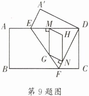 9. (都江堰市一诊) 如图, 在矩形 $ABCD$ 中, 点 $E, F$ 分别在边 $AD, BC$ 上, 将矩形 $ABCD$ 沿直线 $EF$ 折叠, 使点 $B$ 恰好与点 $D$ 重合, 点 $A$ 落在点 $A'$ 处, $G$ 为线段 $EF$ 上一动点, 过点 $G$ 作 $GM ⊥ AD, GN ⊥ FD$, 垂足分别为 $M, N$, 以 $GM, GN$ 为邻边构造平行四边形 $GMHN$. 若平行四边形 $GMHN$ 的周长为 $4\sqrt{10}, AE = 3$, 则 $EF = $____.
