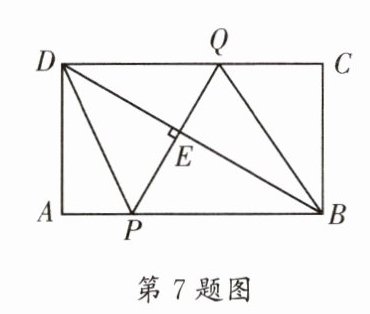 7. (金牛区一诊) 如图, 在矩形 $ABCD$ 中, $AD = \sqrt{3}, ∠DBA = 30^{\circ}, P$ 为边 $AB$ 上的一个动点, 过点 $P$ 作 $PQ ⊥ BD$, 分别交 $BD, CD$ 于点 $E, Q$, 则 $DP + BQ$ 的最小值为