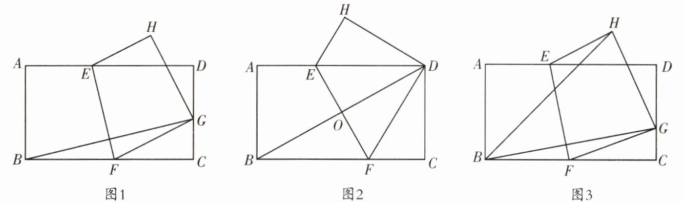 (3)如图 2,连接 $AG$,设 $AG$ 与 $BH$ 的交点为 $O$. $\because$ 线段 $AB$、线段 $HG$ 关于 $EF$ 对称,$\therefore$ 点 $O$ 在对称轴 $EF$ 上,$AG=BH$. 设 $CG=m$. $\because \frac{CG}{DG}=\frac{1}{2}$,$\therefore DG=2m$,$\therefore AB=CD=3m$. $\because \frac{AD}{AB}=k$,$\therefore BC=AD=3km$. ①若 $BG=BH$,$\because AG=BH$,$\therefore BG=AG$. 又 $\because BC=AD$,$\angle C=\angle ADG=90^{\circ}$,$\therefore \triangle BGC\cong \triangle AGD(HL)$,$\therefore CG=DG$,与已知 $\frac{CG}{DG}=\frac{1}{2}$ 矛盾,$\therefore$ 此种情形不存在. ②若 $HG=HB$,$\because OG=OB$,$\therefore HB=OH+OG$. $\because$ 在 $\triangle OGH$ 中,$OH+OG>HG$,$\therefore HB>HG$,$\therefore$ 此种情形不存在. ③若 $GB=HG=3m$,$\because$ 在 $Rt\triangle BCG$ 中,$BG^{2}=BC^{2}+CG^{2}$,$\therefore (3m)^{2}=(3km)^{2}+m^{2}$,解得 $k=\frac{2\sqrt{2}}{3}$(负根已经舍去). 综上所述,$k$ 的值为 $\frac{2\sqrt{2}}{3}$.