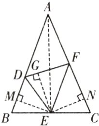 ∴点E在∠BDF与∠DFC的平分线上。如图,过点E分别作EM⊥AB于点M,EN⊥AC于点N,EG⊥DF于点G,连接AE,