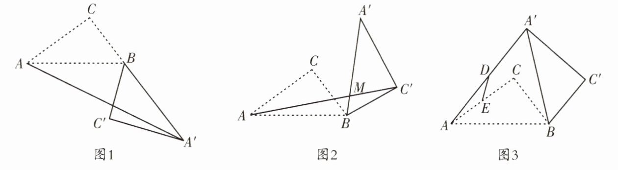 (3)如图 3,连接$AA',D为AA'$的中点,E 为 AC 的中点,连接 DE.在旋转过程中,若$△ADE$是以 DE 为直角边的直角三角形,求 DE 的长.