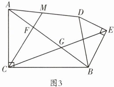 ②如图3,连接AD,延长CF交AD于点M,在$Rt\triangle BDE$旋转的过程中,若点M落在BE的垂直平分线上,求此时AM的长.