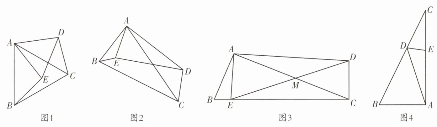 4.(嘉祥)问题背景:如图1,在$\triangle ABC和\triangle AED$中,若$\frac {AB}{AC}= \frac {AE}{AD}= 1,∠BAC= ∠EAD= 60^{\circ }$,易知$BE= CD$,BE与CD的夹角为$60^{\circ }$.