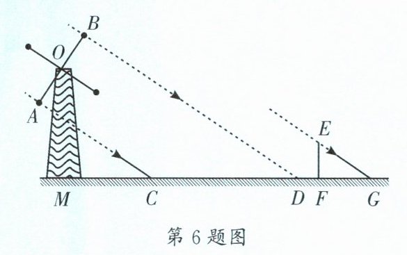 6. (成华区一诊)如图是某风车的示意图,其大小相同的四个叶片均匀分布,点M在旋转中心O的正下方。某一时刻,太阳光恰好垂直照射叶片OA,OB,叶片的影子为线段CD,测得MC= 8.5米,CD= 13米,此时垂直于地面的标杆EF与它的影子FG的比为2:3(其中点M,C,D,F,G在水平地面上),则OM的高度为______米,叶片OA的长为______米.