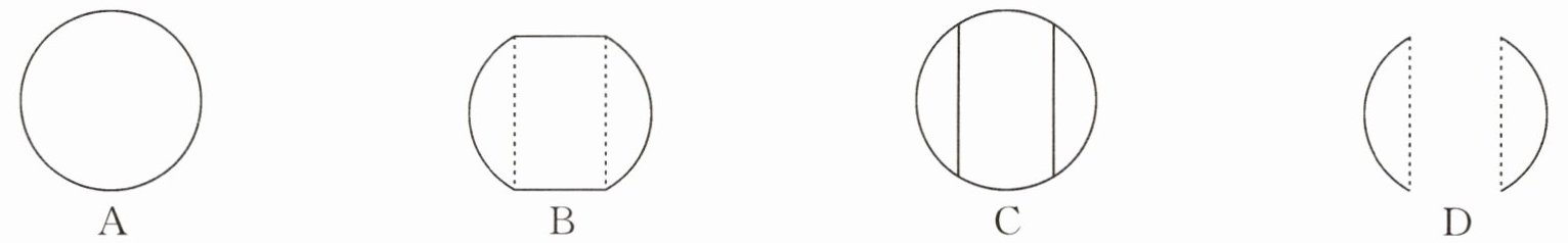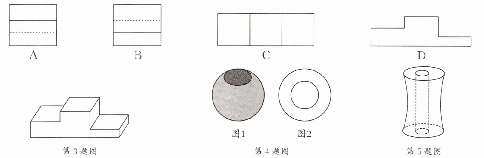 4.(成华区一诊)如图1所示的是某湿地公园湖面上的浮漂,它的形状是中间穿孔的球体,其俯视图如图2所示,那么它的主视图是 (