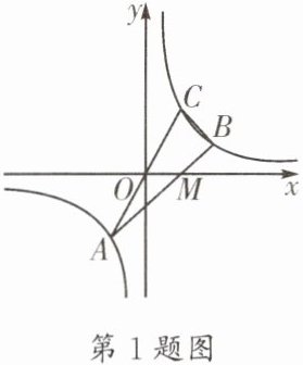 1. (天府新区一诊)如图,直线 AB 与反比例函数$y= \frac {k}{x}$的图象交于 A,B 两点,与 x 轴交于点 M 且满足$\frac {MA}{MB}= 2$,连接 AO 并延长交反比例函数图象于点 C,连接 BC. 若$\triangle ABC$的面积为 24,则 k 的值为____.