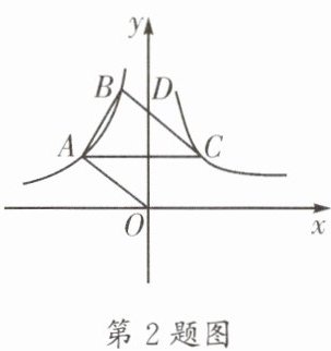 2. (双流区一诊)已知双曲线$y= -\frac {10}{x}(x<0)和y= \frac {k}{x}(x>0)$的图象如图所示,直线 OA 与双曲线$y= -\frac {10}{x}$交于点 A,将直线 OA 向上平移与双曲线$y= -\frac {10}{x}$交于点 B,与 y 轴交于点 D,与双曲线$y= \frac {k}{x}$交于点 C,$S_{\triangle ABC}= 12,BD= \frac {1}{2}CD$,则$k= $____.