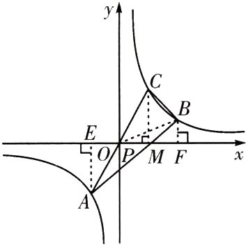 16 【解析】如图,分别过 A,B 两点作 x 轴的垂线,垂足分别为 E,F,则$\triangle AEM\backsim \triangle BFM.\because \frac {MA}{MB}=2,\therefore \frac {AE}{BF}=\frac {MA}{MB}=2$,即$AE=2BF$.设点 B 的坐标为$(\frac {k}{m},m)$,则点 A 的坐标为$(-\frac {k}{2m},-2m).\because A$,C 两点关于原点对称,