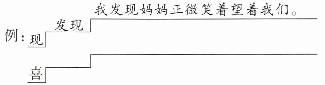 例:现 发现 我发现妈妈正微笑着望着我们。