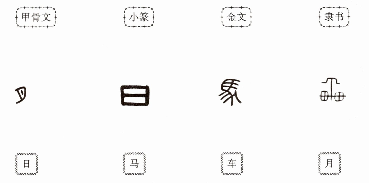 甲骨文——月;小篆——日;金文——马;隶书——车。
