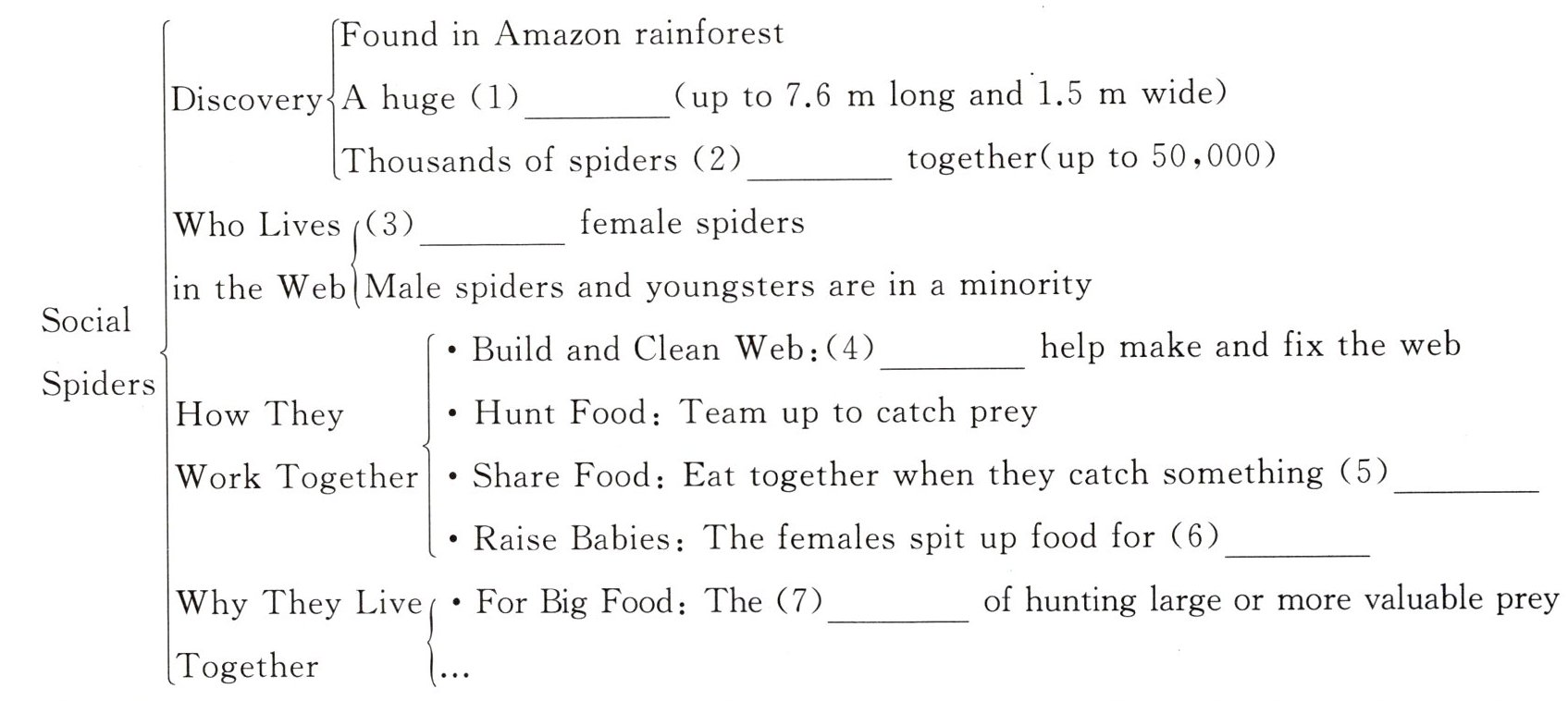 【语篇解读】本文是一篇说明文,介绍了研究人员对群居蜘蛛的研究发现。