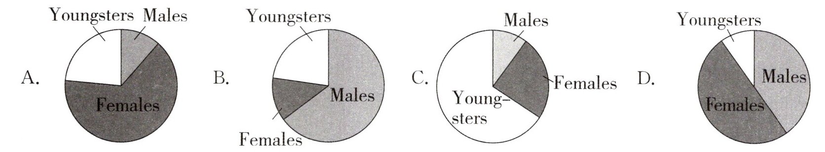 1. A 图示理解题。根据“An Anelosimus eximius colony contains adult males and females as well as youngsters, but the majority of spiders on the web are females. Males account for only between 5% and 22% of any colony's population.”可知,在 Anelosimus eximius 这种蜘蛛群体中,大多数是雌蛛,雄蛛只占 5% 到 22%。故选 A。