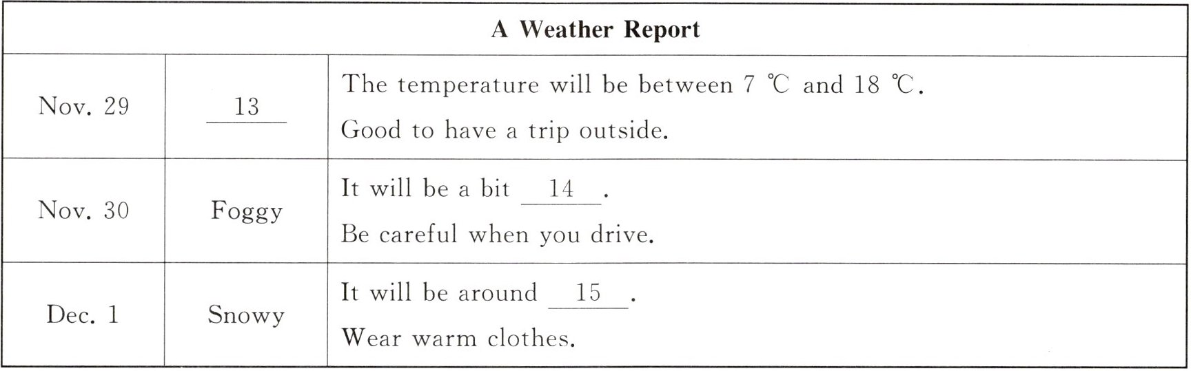 Dec. 1:Snowy,It will be around ____15____. Wear warm clothes.