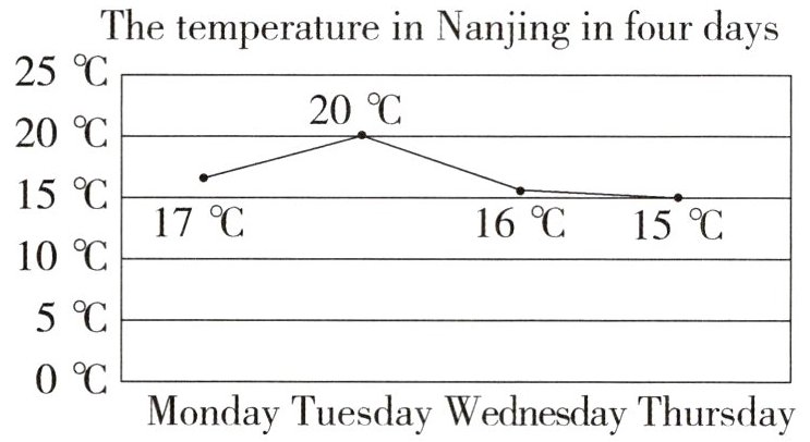 On Monday, the temperature is 17℃, but it is a little windy. On Tuesday, the temperature is 20℃ and it is sunny. On Wednesday and Thursday, it is a little cool. So I advise you to have your trip on Tuesday.