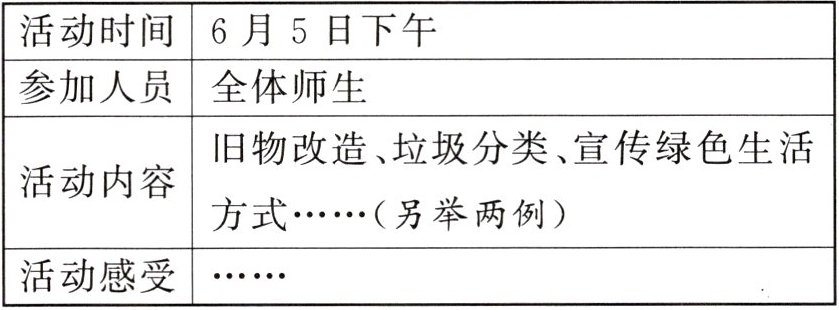 All the students and teachers in our school will take part in the activities on the afternoon of June 5th. There will be different kinds of activities. For example, we can try to make new things out of the old ones and learn to put garbage into different garbage bins. There will also be a speech about how to live a green life. After the speech, we will turn off the lights in our classrooms and walk to the park near our school to pick up the garbage.