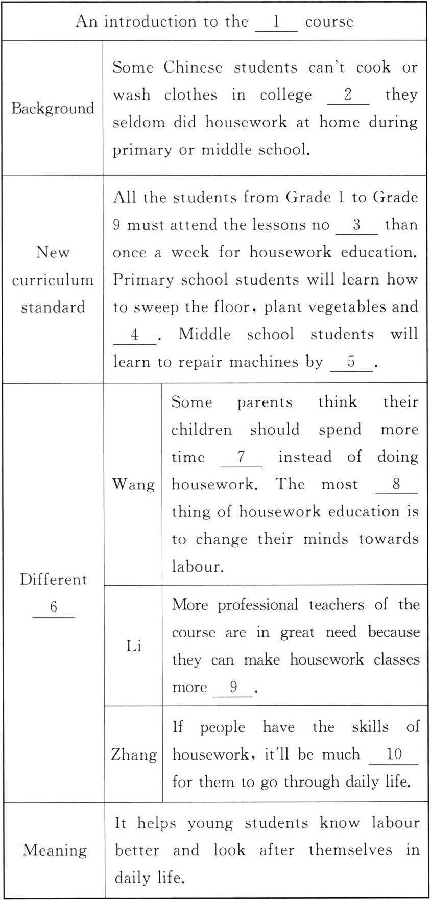 | Different ____ | Wang | Some parents think their children should spend more time ____ instead of doing housework. The most ____ thing of housework education is to change their minds towards labour. |