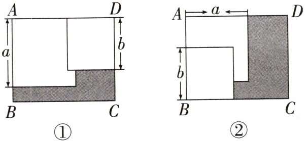 15. (2024·南京期末改编)在长方形$ABCD$中将边长分别为$a$和$b$的两张正方形纸片$(a > b)$按图①和图②两种方式放置(两张正方形纸片均有部分重叠),长方形中未被这两张正方形纸片覆盖的部分用阴影表示,设图①、图②中阴影部分的面积分别为$S_{1},S_{2}$.当$AD=\frac{3}{2}AB$时,$S_{2}-S_{1}$的值为 (