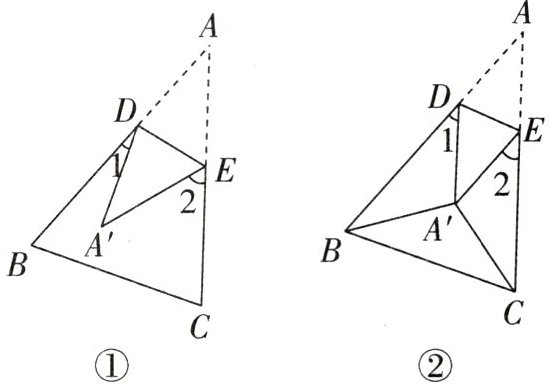 $^{\circ }$;(2)如图②,把$△ABC$折叠后,$BA'$平分$∠ABC,$ $CA'$平分$∠ACB$,若$∠1+∠2=108^{\circ }$,则$∠BA'C$的度数为
