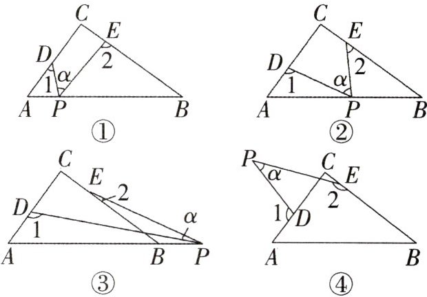 .(2)若点P在边AB上运动,如图②所示,则 $∠α,∠1,∠2$之间的关系为